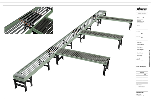 When the pop-up rollers are situated at a 90-degree angle to the primary conveyor belts, the material is transferred to the sorter system at a right angle producing a change in the product direction. This design runs at speeds with a throughput up to 90 containers per minute.